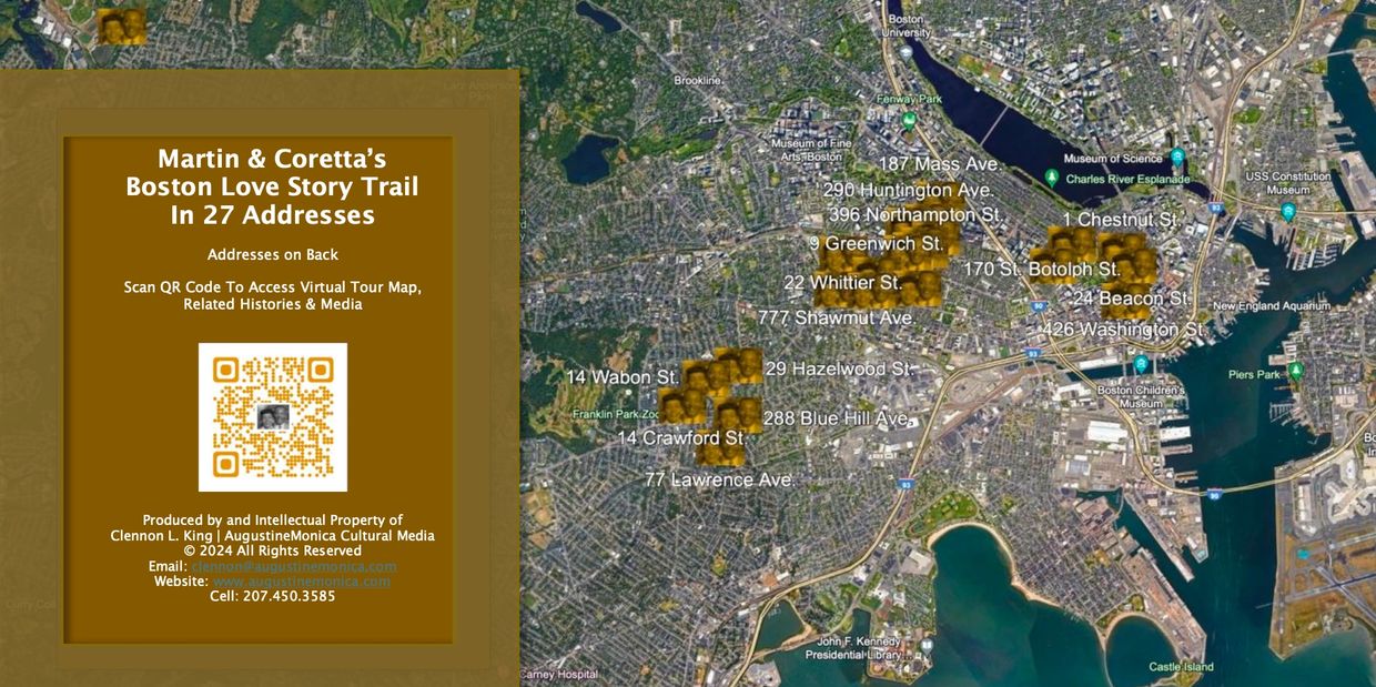 Augustine Monica specializes in cultural projects development, creating films, plaques and heritage trails to tell the story of the marginalize .The firm has done this work in several markets, including Jacksonville, St. Augustine, Bayonne and Tampa. No better example of this exists though, than in the city of Boston, Massachusetts where the firm has developed a 27-address heritage trail around the Boston love story of Martin and Coretta King. See the QR code above to access a digital map and related content to help users conduct a self-guided tour.